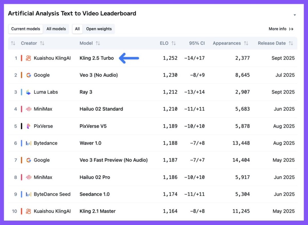 Kling AI’s 2.5 Turbo Video model outperformed Google’s Veo 3 and Luma Labs’ Ray 3 to secure the No.1 spot in both the text-to-video and image-to-video leaderboards, according to the latest results released by Artificial Analysis. The benchmark ranks the video generation models based on user preferences in blind comparisons.